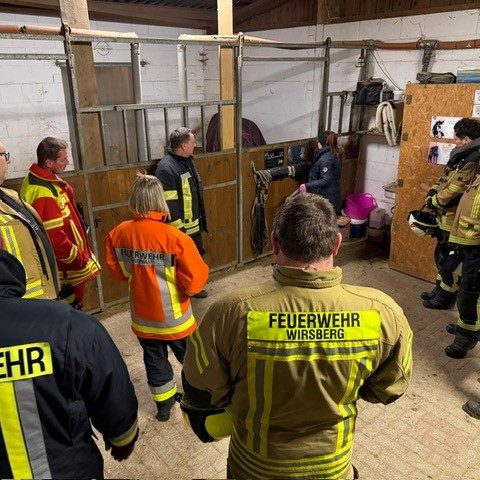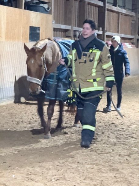 Nach der Theorie durften die Einsatzkräfte dann ans reale Pferd: Annähern in der Box, Aufhaltern und Führen durfte unter Anleitung geübt werden. Und ganz nebenbei wurde auch schon die ein oder andere Freundschaft mit den Tieren geschlossen.